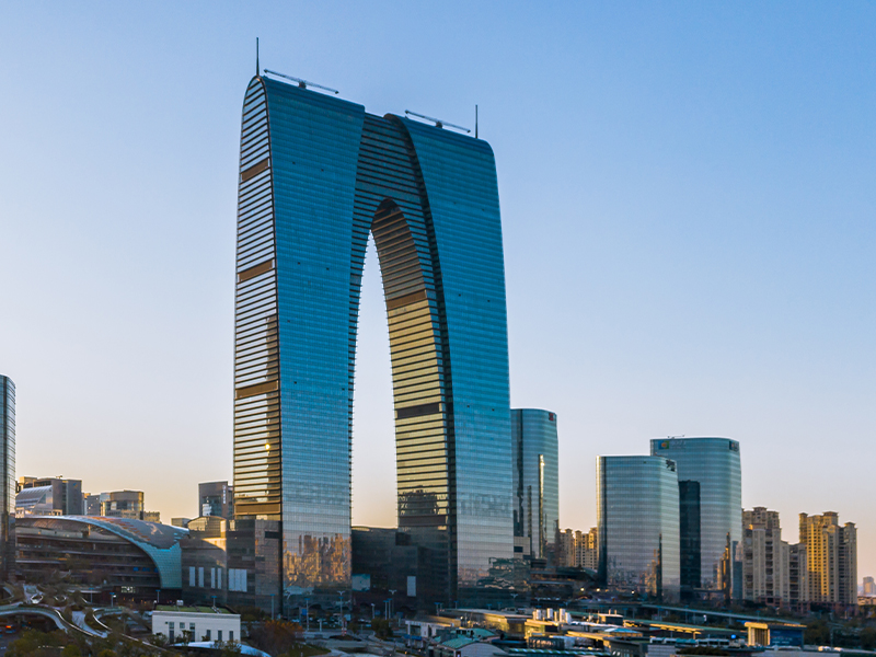 東方之門地處蘇州工業園區CBD軸線的東端,擁有“中國結構最復雜的超高層建筑”、“中國最高無邊際泳池”、“中國最高的過街天河”、“中國最高的空中蘇式園林”等榮譽。